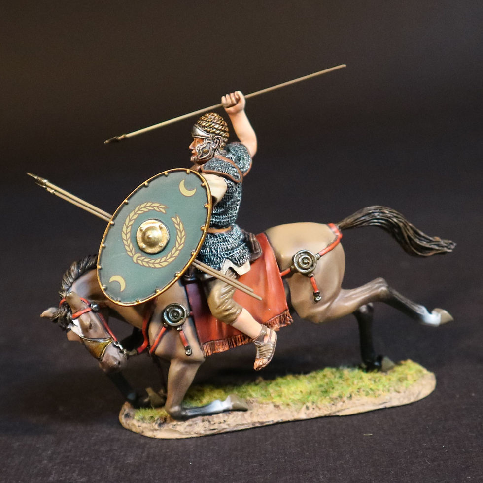 Roman Auxilia cavalry were usually heavily armored in mail and armed with a short lance, javelins, the Spatha long sword, and sometimes bows for specialist Horse archer units. These men primarily served as Medium missile cavalry for flanking, scouting, skirmish, and pursuit.