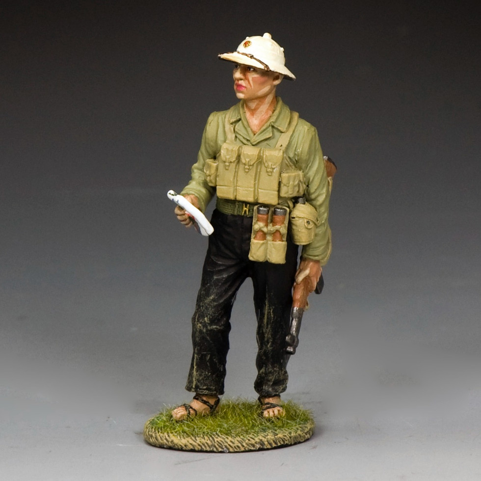 The Viet Cong being a guerrilla organisation had a simplified rank structure with positions such as ‘commander, deputy commander, political officer (commissar), platoon leader and section leader. These ranks helped establish a chain of command structure within the organisation which warfare tactics they employed during the conflict. This figure is wearing a mix of civilian and military clothes as well as standard NVA (North Vietnamese Army) cotton fighting order and the ubiquitous AK47 Assault Rifle. On his head is an uncamouflaged sun helmet which suggests he is in a ‘safe’ area. Scale:1/30Material: Pewter alloy and synthetic fibersReleased Date: July 2024