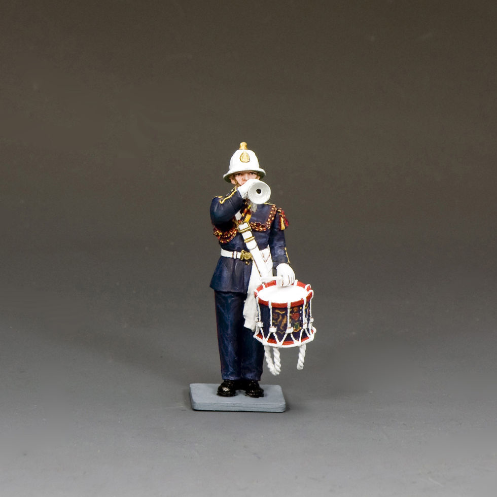 All drummers are also taught the bugle, and are trained by the ‘Bugle Major’. On parade the drummer / buglers lead the band immediately behind the Drum Major on active duty all RM bandsmen act as stretcher bearers.