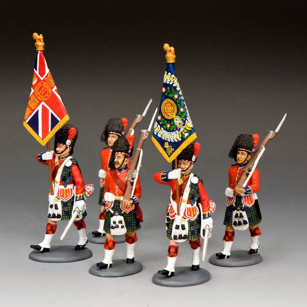 This colourful 5-piece set comprises 2 x flag bearing officers, one holding the Regimental Standard, the other holding the Sovereign’s Standard (it can be the Queen’s Colour or King’s Colour, depending on the monarch on the throne). Between them marches a ‘Colour Sergeant’, usually a senior non- commissioned officer.