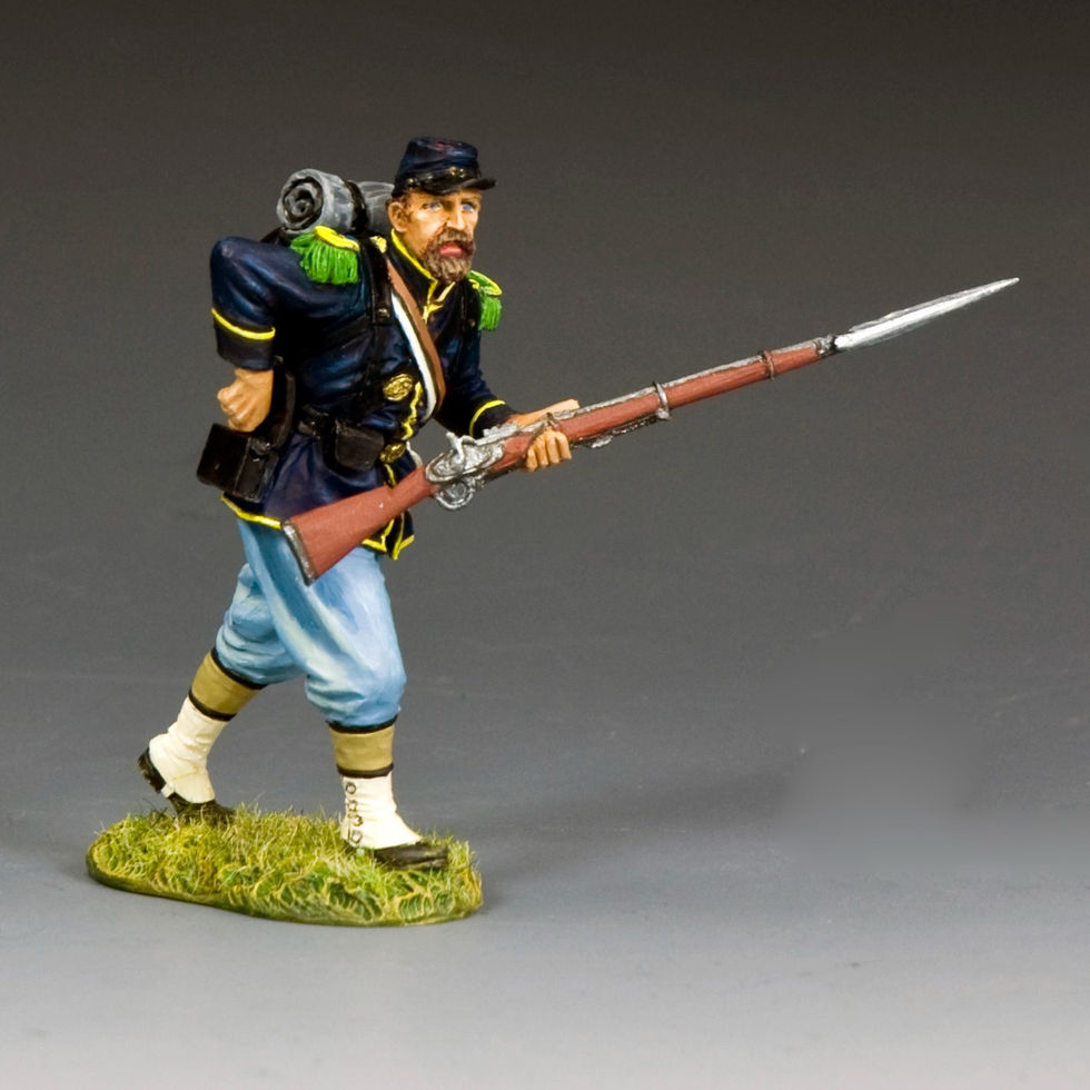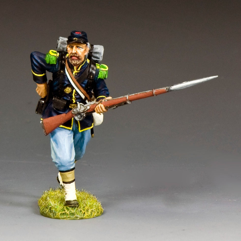 Most infantryman on both the Union and Confederate sides carried a leather cartridge pouch suspended from a leather belt that crossed the chest and hung on the rear right side of the soldier. Most of these pouches contained at least 40 x paper cartridge rounds. Having fired his last round this soldier reaches back and into the open pouch to find another fresh cartridge. Scale: 1/30Material: Pewter alloy and synthetic fiberReleased Date: March 2022