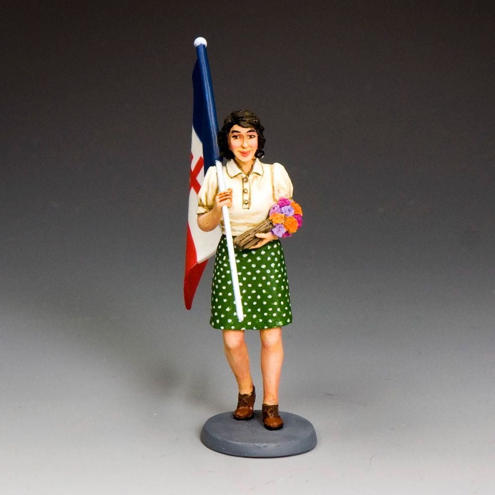 Proudly carrying her French tricoleur complete with the Free French ‘Cross of Lorraine’ in the centre this woman also carries a bouquet of flowers to present to the GIs. Scale: 1/30Material: Pewter alloyReleased Date: June 2024