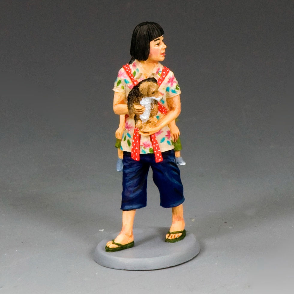 As Hong Kong rapidly grew and prospered it meant both Mothers and Fathers often had to work full-time jobs away from home. That meant older siblings usually were tasked with looking after their younger brothers and sisters and perhaps, even the family pet. This young teenager certainly has her hands full as she carries her younger brother on her back as she cradles an even younger puppy to her chest. Hong Kong children in those days were very resourceful and useful to their parents and took over a host of household duties while Mum and Dad were hard at work. Scale: 1/30Material: Pewter alloyReleased Date: March 2024