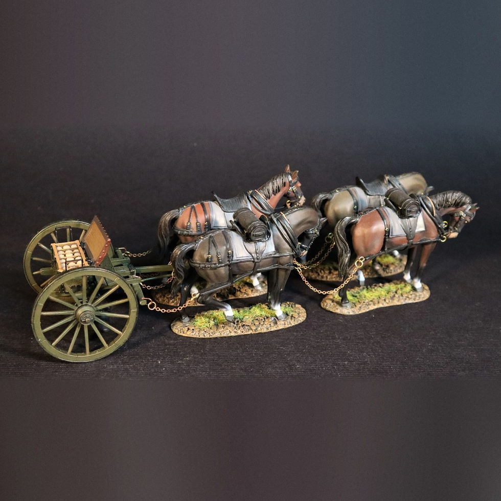 During the early action on Henry House Hill, two batteries were ordered to advance to a position near to the Henry House. These were batteries of the regular US army, efficient and well commanded. Both these batteries had been actively engaged from the very beginning of the battle. The batteries were commanded by Captain James Ricketts, and Captain Charles Griffin. It is believed McDowell made a serious tactical error in giving the order for the batteries to advance up the hill. They were told that the 11th New York Regiment were on their way to support the advance. The southern cause was helped by a case of mistaken identity. Colonel Arthur C. Cummings’s 33rd Virginia Regiment wore blue uniforms. The Colonel afraid his men would break and run if they were held in their position any longer, ordered them to advance towards the guns of Ricketts and Griffin. Griffin saw them coming and swung two of his guns round and had them loaded with cannister. Just as he was about to fire, his superior officer, Major William F. Barry, shouted , “Captain, don’t fire there; those are your battery support.” “They are Confederates” Griffin shouted back, as certain as the world, they are Confederates.” But Barry insisted, and the guns were swung back to their original line of fire. The Virginians, meanwhile marched ever closer, halted and fired a volley. Griffin told a subsequent Board of Inquiry, “was the last of us, We were all cut down.” Most of the horses and many of the gunners were killed. Ricketts was severely wounded. Griffin struggled to save what he could, but Cummings and his Virginians were among them quickly to capture the guns and much ammunition. A typical “field piece” had an authorized crew of 12 enlisted men constituting a “gun section” led by a sergeant and assisted by one (and sometimes two) corporal. Each section consisted of one “gun,” its “limber” (with one ammunition chest also serving as a seat) and (nominally) six horses (but often only four) to pull it, and a “caisson” (with two ammunition chests/ seats, a spare wheel, tools, and crew baggage) with its own limber pulled by another six horses, and two “spare” horses (when available) tethered to the rear of the caisson. Each “vehicle” was known as a “half section.” Two sections under the command of a second lieutenant constituted a platoon. While the platoon commander and the two section sergeants (there were no “platoon sergeants” at that time) rode their own assigned horses, six artillerymen rode the three left-side horses in each half section, while the remaining six privates either rode on the three ammunition chests (two to three per chest/seat) or walked alongside. Three platoons (sometimes only two, especially in Confederate units), plus a small headquarters, under a captain, assisted by a first lieutenant and a first sergeant, constituted a “battery.” Scale: 1/30Material: Pewter alloy and synthetic fibersReleased Date: July 2023