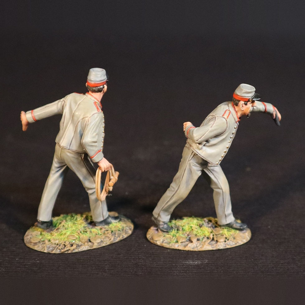 A typical “field piece” had an authorized crew of 12 enlisted men constituting a “gun section” led by a sergeant and assisted by one (and sometimes two) corporal. Each section consisted of one “gun,” its “limber” (with one ammunition chest also serving as a seat) and (nominally) six horses (but often only four) to pull it, and a “caisson” (with two ammunition chests/ seats, a spare wheel, tools, and crew baggage) with its own limber pulled by another six horses, and two “spare” horses (when available) tethered to the rear of the caisson. Each “vehicle” was known as a “half section.” Two sections under the command of a second lieutenant constituted a platoon. While the platoon commander and the two section sergeants (there were no “platoon sergeants” at that time) rode their own assigned horses, six artillerymen rode the three left-side horses in each half section, while the remaining six privates either rode on the three ammunition chests (two to three per chest/seat) or walked alongside. Three platoons (sometimes only two, especially in Confederate units), plus a small headquarters, under a captain, assisted by a first lieutenant and a first sergeant, constituted a “battery.”