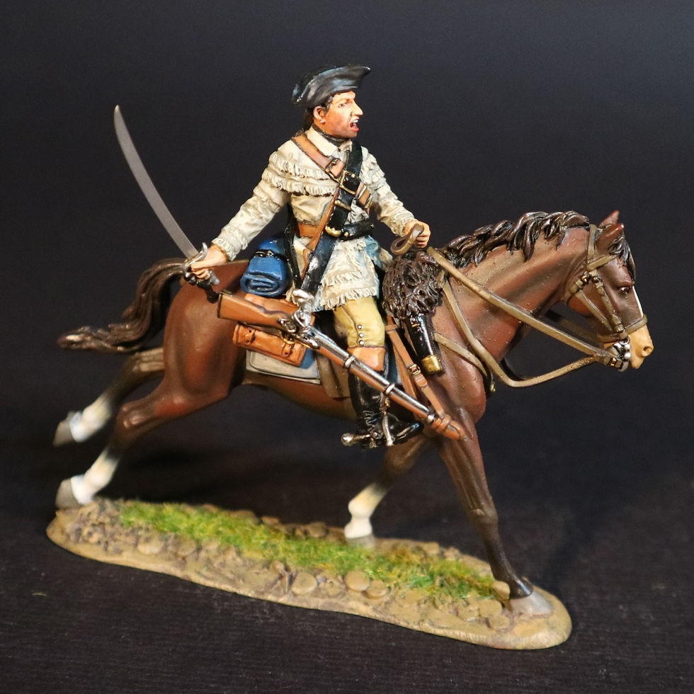 One of Brigadier General Daniel Morgan’s greatest concerns was his lack of adequate numbers of dragoons. Dragoons served both sides as scouts, mounted pickets, mobile reserves, and shock troops. One of their primary functions was to exploit a victory by riding down the remnants of broken enemy infantry. Weapons included a carbine and a brace of heavy pistols, Although according to Colonel William Washington the “only necessary weapon a dragoon carries” was the sabre. Several small volunteer militia contingents were hastily equipped as dragoons to reinforce the cavalry, as it was well known the strength of Tarleton’s mounted legion. Scale: 1/30Material: Pewter alloy and synthetic fibersReleased Date: August 2023