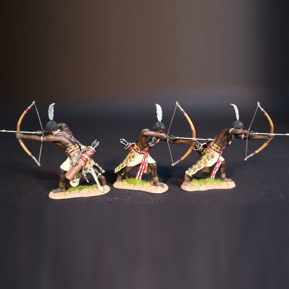 The country of Nubia was divided into distinct regions such as Yam, Irthet and Wawat, but all the peoples were known to the Egyptians as the “vile” Kush, which was the Egyptian name for the country. These tribesmen were never any real threat to Egypt as they lacked any large scale organisations and were only at their best when actually fighting as auxiliaries in the Egyptian forces. The success of the Egyptian infantry units was mainly due to the archery sections which were composed in the main, of Nubians. Nubia had been conquered during the Middle Kingdom, but fell to the king of Kush in the Hyksos period and was finally re-conquered during the New Kingdom. This secured the southern frontier and controlled the Nubian gold mines. Nubia was settled with Egyptian colonists in forts and “temple towns” and governed by a viceroy. Nubian troops had been an important part of the Egyptian army since the old Kingdom. Nubian tribes included the famous Medja who were regarded by the Egyptians as the best scouts and skirmishers. They were known for wearing leopard and lion skin kilts and had ostrich feathers in their hair. The Medjway were very highly regarded by the Egyptians as they seemed to have a natural affinity for the military life. These figures will of course be suitable for the Trojan War series as King Memnon’s army. Memnon was the King of the Ethiopians, who after the death of the Trojan warrior Hector, went to assist his uncle Priam, against the Greeks. He arrived with a great army, and performed prodigies of valour, but was slain by the Greek hero Achilles. According to tradition, Zeus , the king of the gods, was moved by the tears of Eos and bestowed immortality upon Memnon. His companions were changed into birds, called Memnonides, that came every year to fight and lament over his grave Scale: 1/30Material: Pewter alloy and synthetic fibersReleased Date: Septembre 2024
