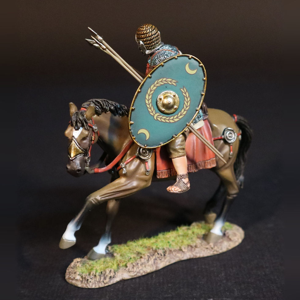 Roman Auxilia cavalry were usually heavily armored in mail and armed with a short lance, javelins, the Spatha long sword, and sometimes bows for specialist Horse archer units. These men primarily served as Medium missile cavalry for flanking, scouting, skirmish, and pursuit.