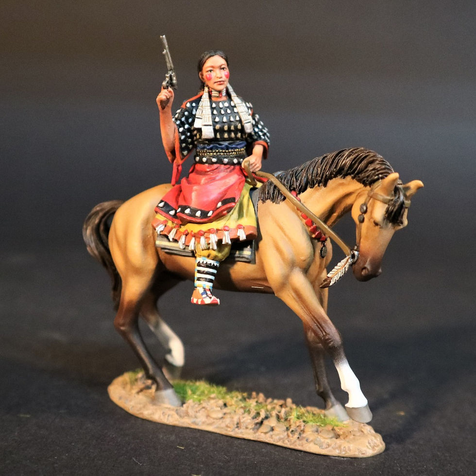The Cheyenne named, the more commonly known The Battle Of The Rosebud, The Battle Where The Girl Saved Her Brother. This was because of an incident during the fight involving the Cheyenne woman Buffalo Calf Road Woman, and her brother Chief Comes In Sight. The battle took place on June 17th 1876 in the Montana territory , between the United States Army and its Crow and Shoshoni allies, against a force consisting mostly of Sioux and Cheyenne Indians. Led by Crazy Horse, the Sioux and Cheyenne managed to halt the offensive of General George Crook, untill August. Buffalo Calf Road Woman, or Brave Woman (c. 1844-1879) was a Northern Cheyenne woman who saved her wounded warrior brother in the Battle of the Rosebud, in 1876. Her rescue helped rally the Cheyenne warriors to win the battle. Later that same year she was to fight alongside her husband in the battle of the Little Bighorn. She was later credited with striking the blow that knocked Lieutenant Colonel George Armstrong Custer off his horse before he died. Under the leadership of Crazy Horse, the Cheyenne and Lakota Sioux had been skirmishing with the United States forces. Many warriors had charged, and one man who had the best horse was in the lead. This was Chief Comes In Sight. Before he could reach the soldiers, his horse was wounded and its hind leg broken. The Cheyenne retreated leaving Chief Comes In Sight on foot in the battlefield. SAs he was walking away with all the soldiers shooting at him, Buffalo Calf Road Woman rode out onto the battlefield at full speed and grabbed up her brother, carrying him to safety. Her courageous rescue caused the Cheyenne to rally, and they defeated General George Crook and his forces. In honour of this brave deed, the Cheyenne named the battle, “The Battle Where The Girl Saved Her Brother.” The battle which ensued would last for six hours and consisted of disconnected actions and charges and counter-charges by Crook and Crazy Horse, the two forces spread out over a fluid front three miles wide. The Lakota Sioux and Cheyenne were divided into several groups as were the soldiers as the battle progressed. The soldiers could fend off assaults by the Indians and force them to retreat but could not catch and destroy them. The soldiers were impressed with the swarming Indians. "They were the best cavalry soldiers on earth. In charging up toward us they exposed little of their person, hanging on with one arm around the neck and one leg over the horse, firing and lancing from underneath the horses' necks, so that there was no part of the Indian at which we could aim." By the standards of the usual hit-and-run raids of the Plains Indians, the Battle of the Rosebud was a long and bloody engagement. The Lakota and Cheyenne fought with persistence and demonstrated a willingness to accept casualties rather than break off the encounter. The delaying action by Crook's Indian allies during the early stages of the battle saved his command from a devastating surprise attack. The intervention of the Crow and Shoshoni scouts throughout the battle was crucial to averting disaster for Crook. Crook claimed victory by virtue of occupying the battlefield at the end of the day, but his actions belie his claim. Concerned for his wounded and short on supplies, Crook retraced his steps to his camp on Goose Creek, near Sheridan, Wyoming, and remained there immobile for seven weeks awaiting reinforcements. He would play no role in the Battle Of Little Big Horn, eight days later. Crook's Crow and Shoshoni allies left the army for their homes shortly after the battle. The Lakota and Cheyenne returned to the battlefield after Crook's departure and piled up rocks at the location of key events in the battle. Some of the rock piles they built are still there. Scale: 1/30Material: Pewter alloy and synthetic fibersReleased Date: December 2022