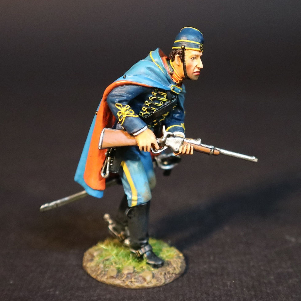 Towards the war’s end most of the Federal cavalry were equipped and supplied via centralized depots, one of the units which stood out as belonging to another time and place was the 3rd New Jersey Cavalry, or the “Butterflies”, a nickname they were given for their flamboyant attire. Raised initially in January 1864 as the 1st U.S. Hussars, they were dressed in such splendour previously unseen in other Federal cavalry regiments, which was deliberate in an attempt to attract new recruits. Yet their appearance was deceptive, as they were the embodiment of what the Union cavalryman had become by 1865. They were heavily armed with repeating Spencer carbines and .44 Remington revolvers which gave them the edge in skirmishes and melees with rebel cavalry and infantry units. The state paid for the additions to the regulation cavalry uniform, the cap was the issue forage cap with the peak removed, extra braid was placed on the jacket and the remainder was US army regulation. This unit was typical of the new horse soldier which served under General Sheridan, they no longer merely served as a screen for advancing infantry. They possessed tremendous fire power and had the ability to hit the enemy hard and fast. They had eveloved into a powerful force capable of independent action. The 3rd New Jersey would serve with distinction until the war’s end routing southern cavalry at Tom’s Brook, Virginia, and seeing action at the Battle of Five Forks, which helped force Lee’s battered army out of its fortifications around Petersburg. Scale:1/30Material: Pewter alloy and synthetic fibersReleased Date: April 2024