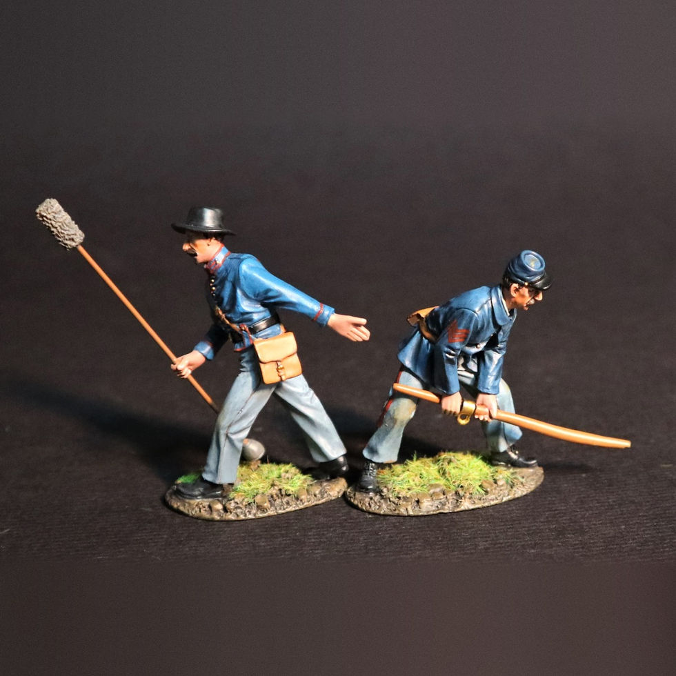 During the early action on Henry House Hill, two batteries were ordered to advance to a position near to the Henry House. These were batteries of the regular US army, efficient and well commanded. Both these batteries had been actively engaged from the very beginning of the battle. The batteries were commanded by Captain James Ricketts, and Captain Charles Griffin. It is believed McDowell made a serious tactical error in giving the order for the batteries to advance up the hill. They were told that the 11th New York Regiment were on their way to support the advance. The southern cause was helped by a case of mistaken identity. Colonel Arthur C. Cummings’s 33rd Virginia Regiment wore blue uniforms. The Colonel afraid his men would break and run if they were held in their position any longer, ordered them to advance towards the guns of Ricketts and Griffin. Griffin saw them coming and swung two of his guns round and had them loaded with cannister. Just as he was about to fire, his superior officer, Major William F. Barry, shouted , “Captain, don’t fire there; those are your battery support.” “They are Confederates” Griffin shouted back, as certain as the world, they are Confederates.” But Barry insisted, and the guns were swung back to their original line of fire. The Virginians, meanwhile marched ever closer, halted and fired a volley. Griffin told a subsequent Board of Inquiry, “was the last of us, We were all cut down.” Most of the horses and many of the gunners were killed. Ricketts was severely wounded. Griffin struggled to save what he could, but Cummings and his Virginians were among them quickly to capture the guns and much ammunition. A typical “field piece” had an authorized crew of 12 enlisted men constituting a “gun section” led by a sergeant and assisted by one (and sometimes two) corporal. Each section consisted of one “gun,” its “limber” (with one ammunition chest also serving as a seat) and (nominally) six horses (but often only four) to pull it, and a “caisson” (with two ammunition chests/ seats, a spare wheel, tools, and crew baggage) with its own limber pulled by another six horses, and two “spare” horses (when available) tethered to the rear of the caisson. Each “vehicle” was known as a “half section.” Two sections under the command of a second lieutenant constituted a platoon. While the platoon commander and the two section sergeants (there were no “platoon sergeants” at that time) rode their own assigned horses, six artillerymen rode the three left-side horses in each half section, while the remaining six privates either rode on the three ammunition chests (two to three per chest/seat) or walked alongside. Three platoons (sometimes only two, especially in Confederate units), plus a small headquarters, under a captain, assisted by a first lieutenant and a first sergeant, constituted a “battery.” Scale: 1/30Material: Pewter alloy and synthetic fibersReleased Date: May 2023