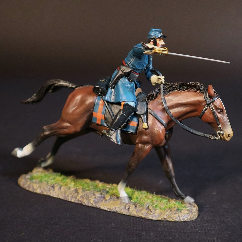 THE BATTLE OF BRANDY STATION, JUNE 9th, 1863 CONFEDERATE DISMOUNTED CAVALRY The Battle of Brandy Station, also called the Battle of Fleetwood Hill, was the largest predominantly cavalry engagement of the American Civil War, as well as the largest ever to take place on American soil. It was fought on June 9th, 1863, around Brandy Station, Virginia at the beginning of the Gettysburg Campaign by the Union cavalry under Maj.Gen. Alfred Pleasonton against Maj. Gen. J.E.B. Stuart’s Confederate cavalry. After an all day fight in which fortunes changed repeatedly, the Federals retired without discovering Gen. Robert E. Lee’s infantry camped near Culpeper. This battle marked the end of the Confederate cavalry’s dominance in the East. From this point in the war the Federal cavalry gained strength and confidence. The Battle saw nine thousand Union cavalrymen and three thousand Union infantry clash with ten thousand Confederate horsemen. The fighting lasted for roughly twelve hours and covered dozens of square miles. Unknown to the Confederates, 12,000 Union men had massed on the other side of the Rappahannock River. Maj. Gen. Alfred Pleasonton, commanding the Cavalry Corps of the Army of The Potomac, had organized his combined armed forces into two wings, under Brig. Gen. John Buford and David McMurtrie Gregg, augmented by infantry brigades from the V Corps. Buford’s wing, accompanied by Pleasonton, consisted of his own 1st Cavalry Division, a reserve brigade led by Maj. Charles J. Whiting, and an infantry brigade of 3,000 men under Brig. Gen. Adelbert Ames. Gregg’s wing was the 2nd Cavalry Division, led by Col. Alfred N. Duffie, the 3rd Cavalry Division led by Gregg, and an infantry brigade under Brig. Gen. David A. Russell. The commander of the Army of the Potomac, Maj. Gen. Joseph Hooker, interpreted the enemy’s cavalry presence around Culpeper to be indicative of preparations for a raid of his army’s supply lines. In reaction to this, he ordered Pleasonton’s force on a “spoiling raid”, to “disperse and destroy” the Confederates. Pleasonton’s attack plan called for a two-pronged thrust at the enemy. Buford’s wing would cross the river at Beverly’s Ford, two miles northeast of Brandy Station, at the same time, Gregg would cross at Kelly’s Ford, six miles downstream to the southeast. Pleasonton anticipated that the Southern cavalry would be caught in a double envelopment, surprised, outnumbered, and beaten. He was, however, unaware of the precise disposition of the enemy and he incorrectly assumed that his force was substantially larger than the Confederates he faced. The increased accuracy and range of rifled firearms and artillery had brought an end to battle cavalry as used by Frederick the great, Napoleon and as recently as in the wars of the Crimea and Italy. Cavalry had learned to fight mounted and dismounted, in effect becoming dragoons. Cavalry, normally did not now participate in battles, operating instead in front of and on the edges of armies. They could be scouts, raiders, escorts for wagon trains and mounted generals. The glory years of the horse soldier were almost over. In less than a hundred years they would be replaced by aircraft, motorized and mechanized units. When a cavalry regiment dismounted, one trooper out of every four held the reins of his own horse and three of his comrades. A typical cavalry charge against cavalry was a relatively rare occurrence, usually with one side or the other breaking and bolting before contact. If hand to hand combat ensued, the fighting was confusing, vicious and protracted. If one side committed reserve squadrons to the fray, they often carried the day. Scale: 1/30 Material: Pewter alloy and synthetic fibers Released Date: February 2025