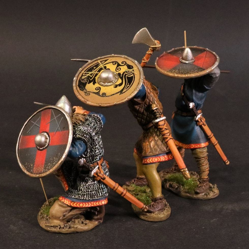 The formation of a shield wall (Skjaldborg in Old Norse) was a popular military tactic that was commonly used in many parts of Northern Europe, especially England and Scandinavia. There were many slight variations of this tactic, but in general, a shield wall was a “wall of shields” formed by warriors standing in formation shoulder to shoulder, holding their shields so that they abut or overlap. Each warrior benefited from the protection of his neighbours’ shields as well as his own. The shield-wall tactic suited inexperienced troops such as the English Fyrd or free peasant, as it did not require extraordinary skill, being essentially a shoving and fencing match with weapons. The first three ranks of the main wall would have been made up of select warriors, such as Huscarls and Thengs, who carried heavier weapons and wore armour. The vast majority of opponents were armed with spears, which they used against the unprotected legs or faces of their opponents. Often soldiers would use their weapons to support each other by stabbing and slashing to the left or the right, rather than just ahead. Short weapons such as the ubiquitous seax could also be used in the tight quarters of the wall. The tactic was used at the Battle of Stamford Bridge, where the relatively well-armed Saxon army attacked the army of King Harald Sigurdsson of Norway. The Vikings were not wearing as much armour, having left their chain mail behind on the ships and wearing only their helmets, and after a bloody shield wall battle, they broke and fled in panic. The drawback of the shield-wall tactic was that, once breached, the whole affair tended to fall apart rather quickly. Relatively lightly trained fyrdmen gained morale from being shoulder-to-shoulder with their comrades, but often fled once this was compromised. Once the wall was breached, it could prove difficult or impossible to re-establish a defensive line, and panic might well set in among the defenders. Although the importance of cavalry in the Battle of Hastings saw the end of the shield wall tactic, massed shield walls would continue to be employed right up to the end of the 12th Century, especially in areas that were unsuitable for large scale mounted warfare, such as Scandinavia, and Scotland. In the late Middle Ages, the shield was abandoned in favour of polearms carried with both hands, giving rise to pike square tactics. Scale: 1/30Material: Pewter alloy and synthetic fibersReleased Date: September 2021