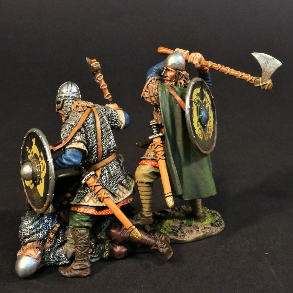 The formation of a shield wall (Skjaldborg in Old Norse) was a popular military tactic that was commonly used in many parts of Northern Europe, especially England and Scandinavia. There were many slight variations of this tactic, but in general, a shield wall was a “wall of shields” formed by warriors standing in formation shoulder to shoulder, holding their shields so that they abut or overlap. Each warrior benefited from the protection of his neighbours’ shields as well as his own. The shield-wall tactic suited inexperienced troops such as the English Fyrd or free peasant, as it did not require extraordinary skill, being essentially a shoving and fencing match with weapons. The first three ranks of the main wall would have been made up of select warriors, such as Huscarls and Thengs, who carried heavier weapons and wore armour. The vast majority of opponents were armed with spears, which they used against the unprotected legs or faces of their opponents. Often soldiers would use their weapons to support each other by stabbing and slashing to the left or the right, rather than just ahead. Short weapons such as the ubiquitous seax could also be used in the tight quarters of the wall. The tactic was used at the Battle of Stamford Bridge, where the relatively well-armed Saxon army attacked the army of King Harald Sigurdsson of Norway. The Vikings were not wearing as much armour, having left their chain mail behind on the ships and wearing only their helmets, and after a bloody shield wall battle, they broke and fled in panic. The drawback of the shield-wall tactic was that, once breached, the whole affair tended to fall apart rather quickly. Relatively lightly trained fyrdmen gained morale from being shoulder-to-shoulder with their comrades, but often fled once this was compromised. Once the wall was breached, it could prove difficult or impossible to re-establish a defensive line, and panic might well set in among the defenders. Although the importance of cavalry in the Battle of Hastings saw the end of the shield wall tactic, massed shield walls would continue to be employed right up to the end of the 12th Century, especially in areas that were unsuitable for large scale mounted warfare, such as Scandinavia, and Scotland. In the late Middle Ages, the shield was abandoned in favour of polearms carried with both hands, giving rise to pike square tactics. Scale: 1/30Material: Pewter alloy and synthetic fibersReleased Date: February 2022