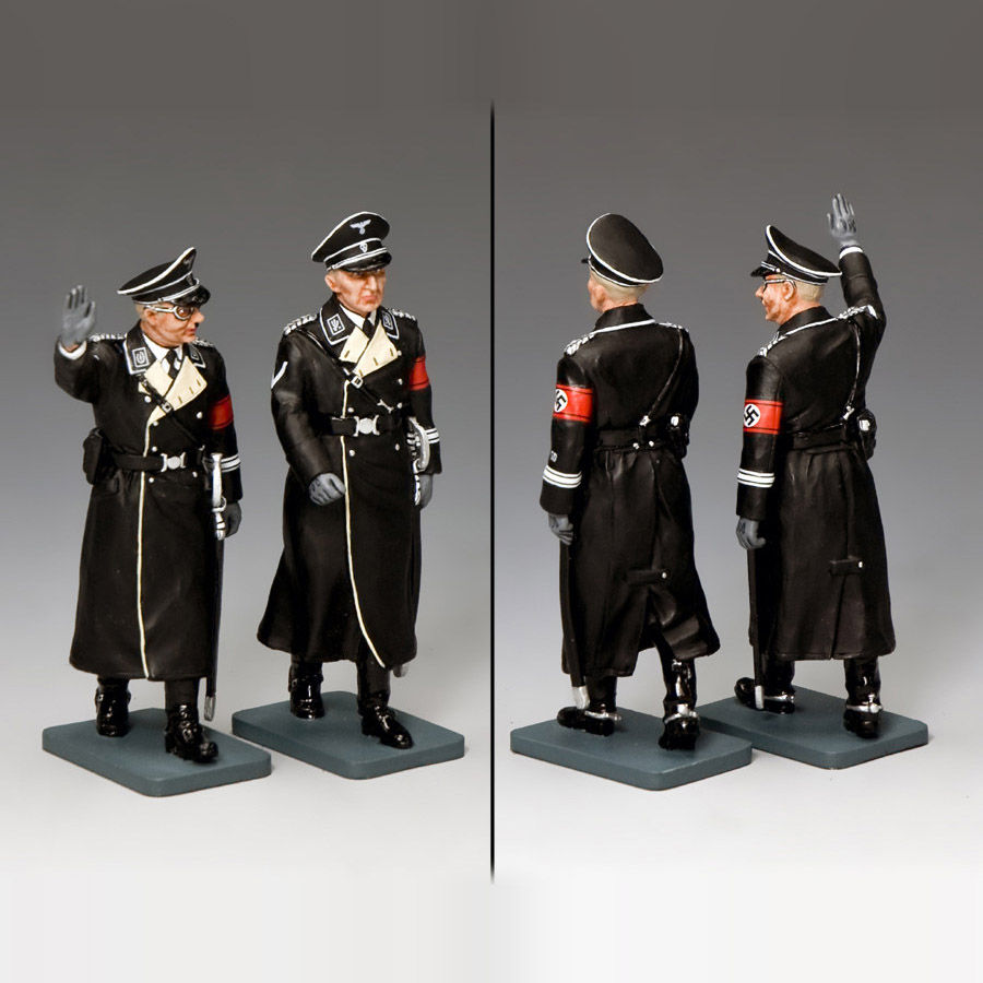 Two of the most dangerous characters in the Nazi Hierarchy... and the most well-known (after Hitler) ... Reichsführer SS Heinrich Himmler and his deputy, SS Obergruppenführer Reinhard Heydrich. Here we see the infamous pair in their pre war black SS uniforms... Himmler, in front saluting, Heydrich following close behind. Between them they led the dark, evil empire that was the SS and Gestapo until Heydrich’s well-deserved assassination by Czech patriots in Prague in 1942.