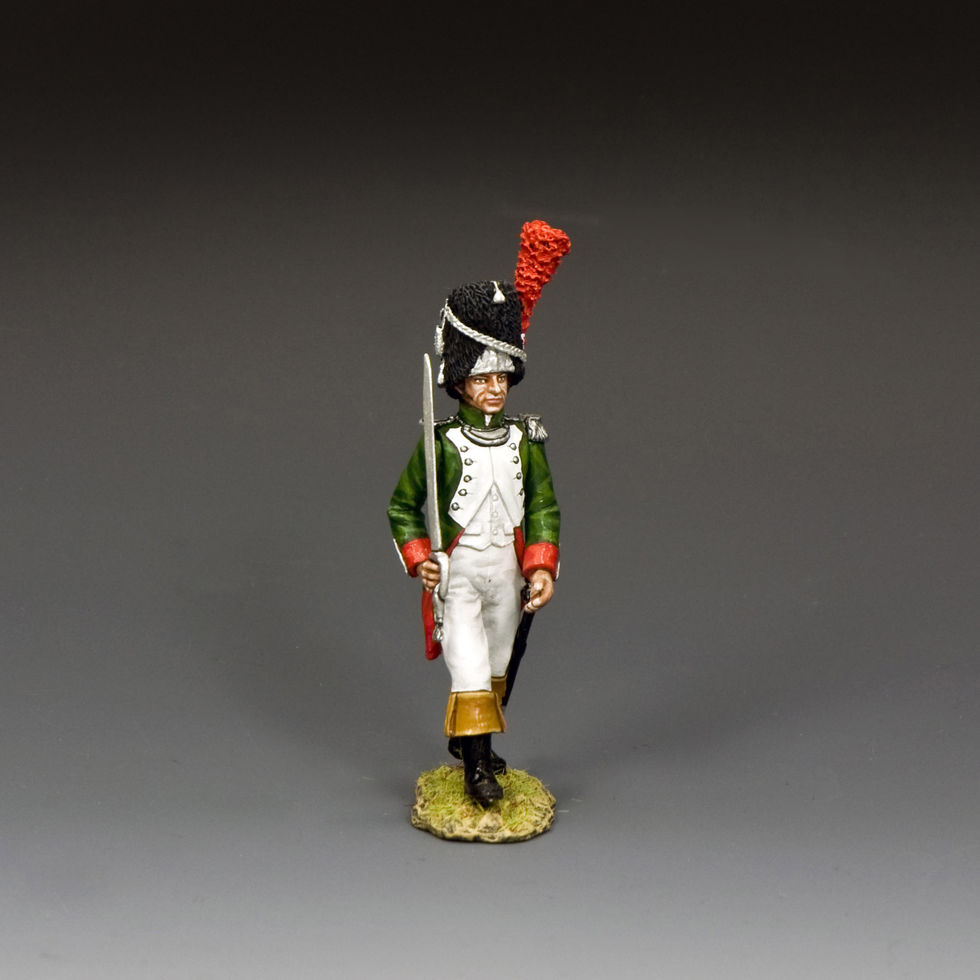Officers of the Regiment had uniform jackets in green with white facings on the chest. They would wear riding boots instead of the long dark grey leggings of the majority of the rank and file Grenadiers.