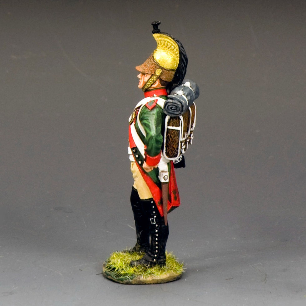A Dragoon in his green tunic with the red facings and wearing the traditional brass helmet topped with the long horse-hair crest. Scale: 1/30Material: Pewter alloy and synthetic fibersReleased Date: October 2022