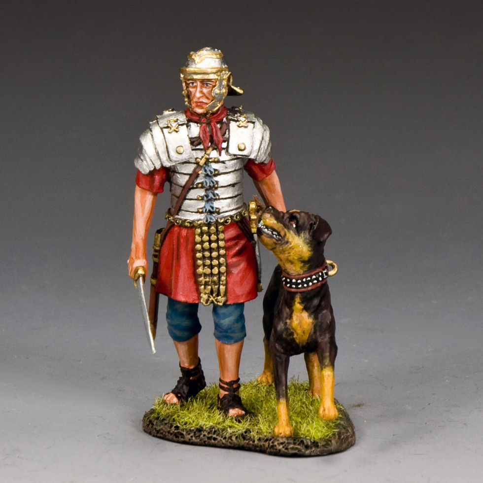In Roman times the ‘Cane Corso’ dogs were used in all kinds of vicious and cruel ‘blood sports’ such as bull-baiting, tiger and lion fighting as well as gladiatorial battles and dog-fighting. By necessity the animals were bred to be big and very dangerous to everyone with the obvious exception of their trainers and handlers. The Roman Army also made use of these large fighting dogs to attack their enemies and help guard their prisoners... Some Roman units even produced special armour to protect their animals. This set includes the dog and his handler with sword drawn moving towards the enemy.