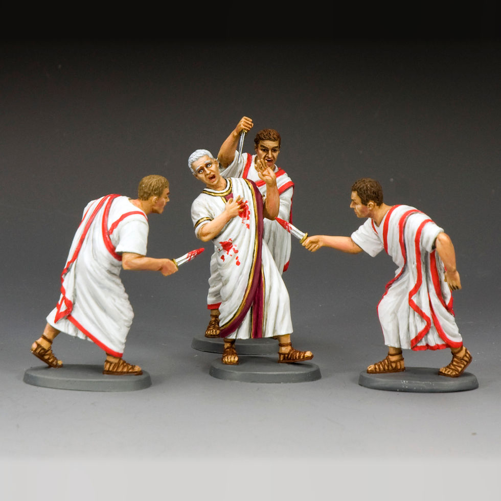 Lured to a meeting of the Senate by a group of Senators, he was stabbed no less than 23 times before dying. Among the principal conspirators (and assassins) of Caesar were Marcus Brutus, Gaius Cassius and Decimus Albinus.All three are part of this set.