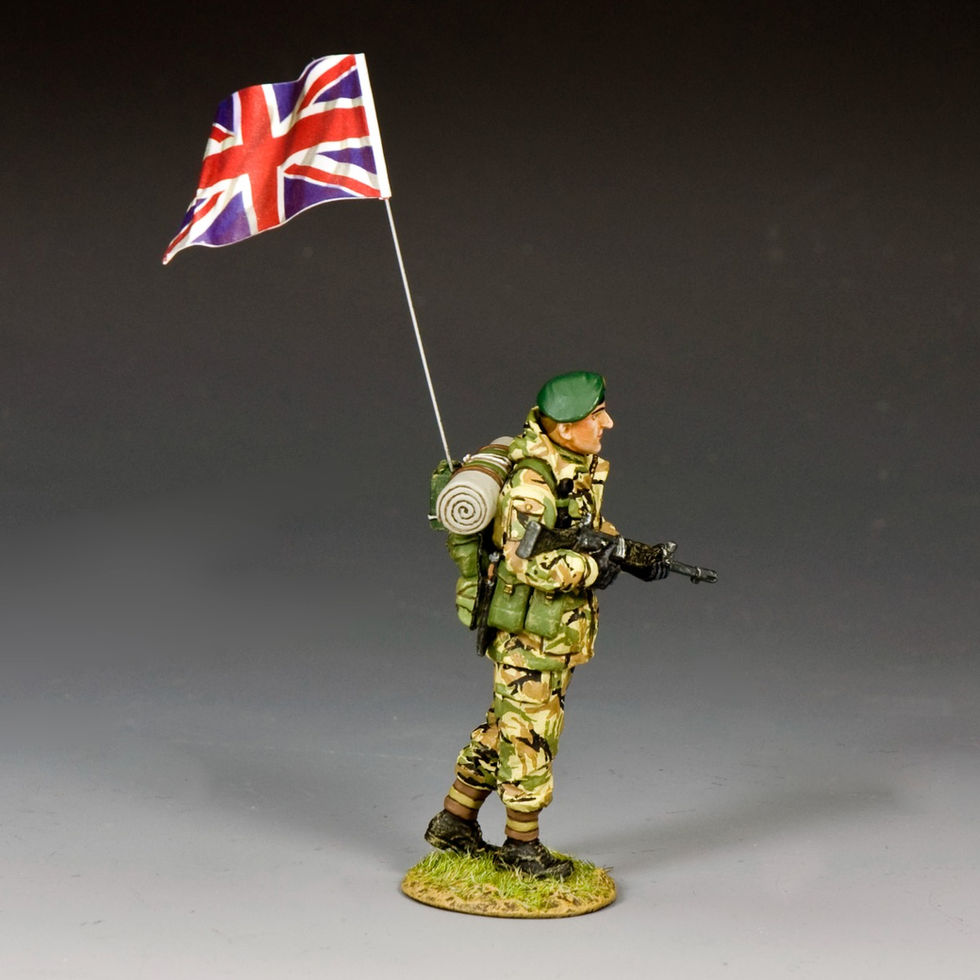 Probably the most iconic image of the Falklands War on land is the photo taken by Petty Officer Peter Holdgate, a Commando Forces Photographer while accompanying British forces ‘yomping’ towards Port Stanley during the war.At one point on the march one of the Royal Marines attached a small ‘Union Jack’ to the radio antenna of another Marine’s field radio.This simple, straight forward image of a long line of British fighting men marching towards their objective and ‘flying the flag’ seemed to represent the kind of grit, courage and determination of Britain itself to recapture the Falklands and liberate its small, captive population from a cruel, despotic south American dictatorship.King & Country’s initial offering is our portrayal in miniature of this lone Royal Marine ‘yomping’ towards eventual victory and defying all odds.Additional Falklands War Royal Marines will be released in early 2022 while others, including the famous ‘Red Berets’ and some Argentinians are already ‘in the works’.Scale: 1/30Material: Pewter alloy and synthetic fibersReleased Date: December 2021