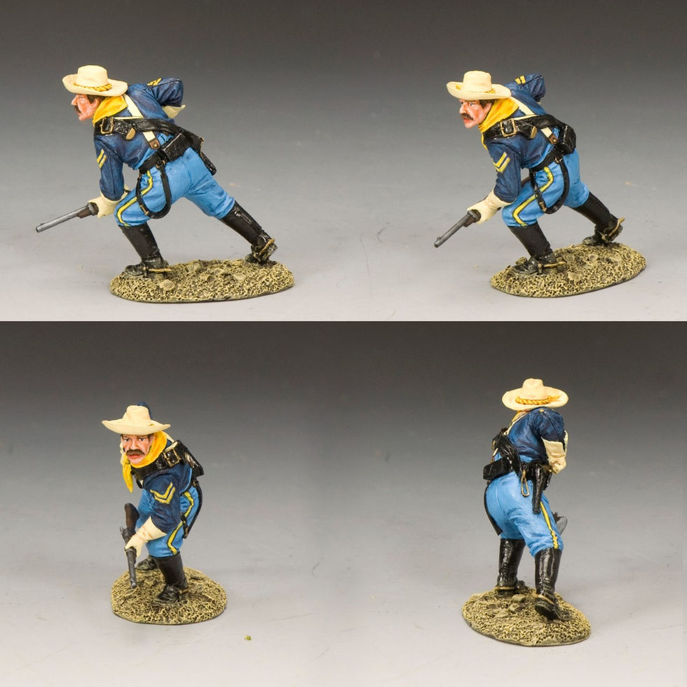In all of Ford’s ‘Trilogy’ movies the main weapon of his cavalrymen is the Springfield Model 1873 Carbine! In addition, all ranks would carry the ‘Colt Single Action Army’ pistol with the 7.5” long barrel. Also of note. All of these new figures, with the exception of the officer have a black leather Carbine Sling worn over their left shoulders. This allowed mounted soldiers to be able to ride their horses and use both hands while their carbines were attached securely to the leather sling on their right side but still be within easy reach. Previously this ‘Carbine Sling’ was not seen on earlier JFC figures but was much requested by K&C collectors of the range. Scale: 1/30Material: Pewter alloyReleased Date: December 2024